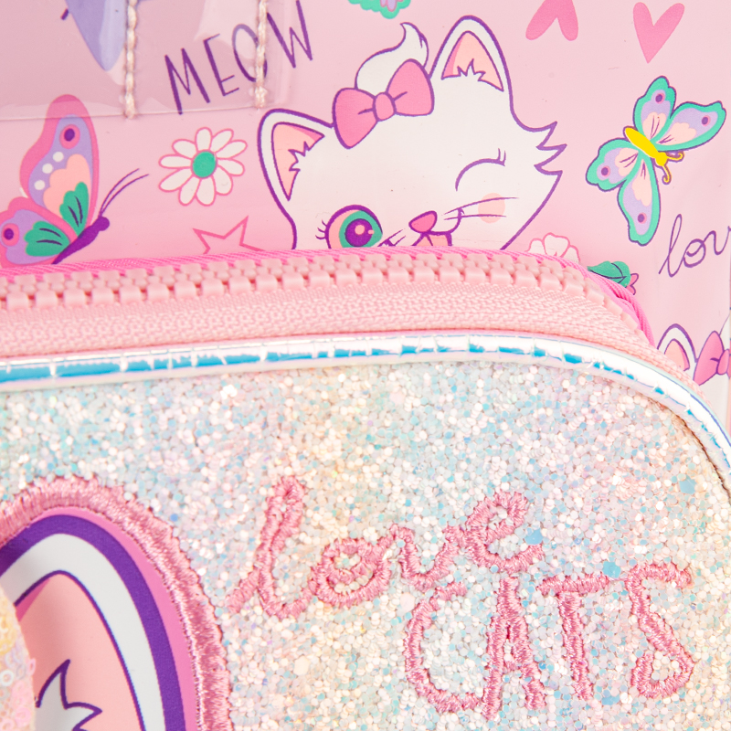 كوله پشتی کودک گربه از برند وست با طرح گربه یک کوله پشتی زیبا و جادار مناسب دوران ابتدایی کودک است. این کوله پشتی دارای بند دوشی قابل تنظیم ارتفاع برای کودکان است، مناسب گروه سنی 5 تا 7 سال است. این کوله پشتی دارای یک دستگیره، بند سر شانه اسفنجی نرم و مشبک با قابلیت تنظیم ارتفاع، یک زیپ بزرگ و کاربردی و یک زیپ کوچک و فانتزی است؛ همچنین دارای 2 جای قمقمه در دو طرف است.